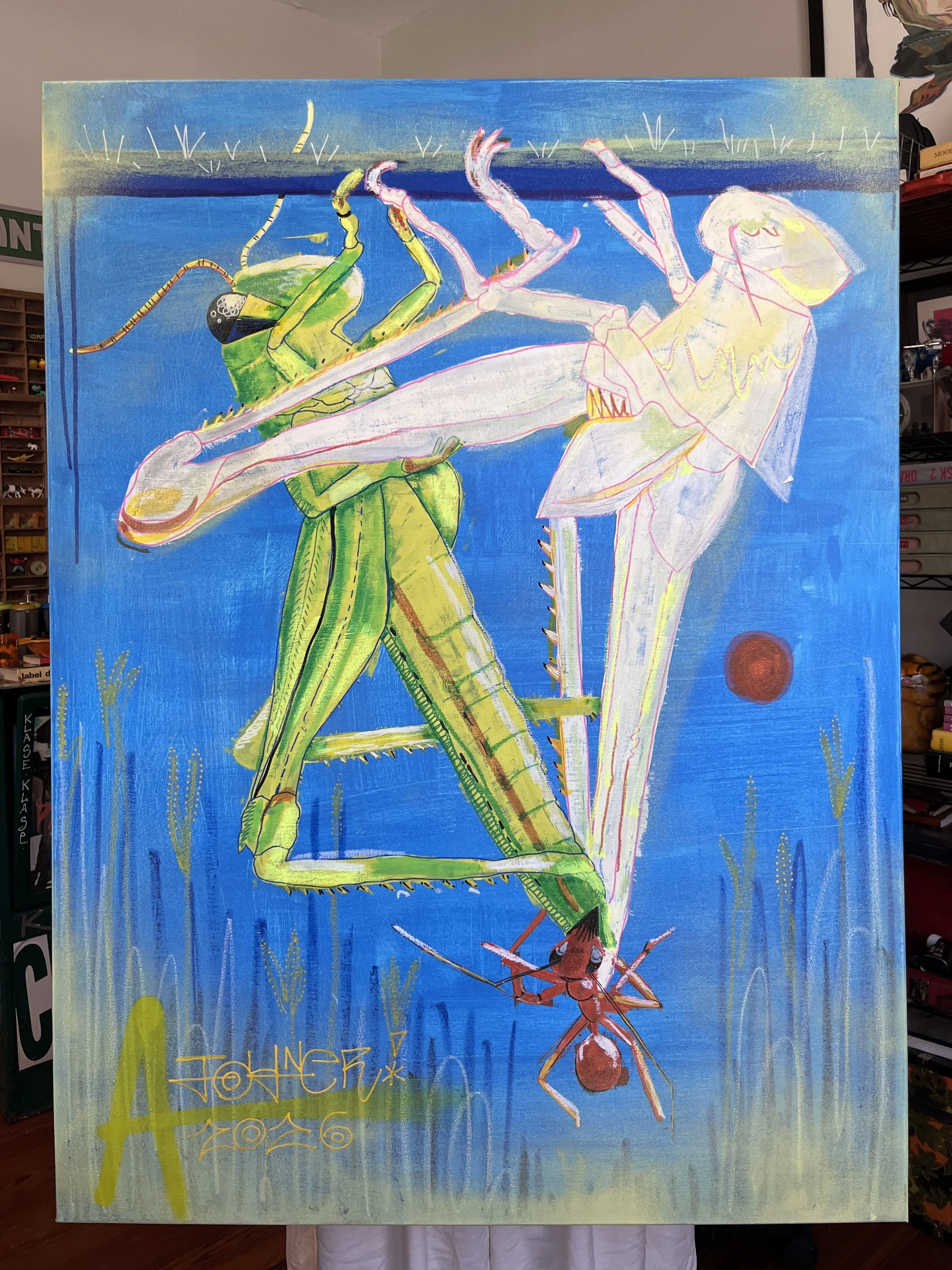 I broke out every paint stick, pastel, pen, and spray can I had and went to town on the thing— marking and layering, and layering some more. I felt like a cartoon depiction of an “artist” where they are shown flinging paint at a canvas in a fit of inspiration. I hoped this was the way, but the more I flung, the less I cared about what the stroke would look like, and the more I was having fun just being a cartoon.