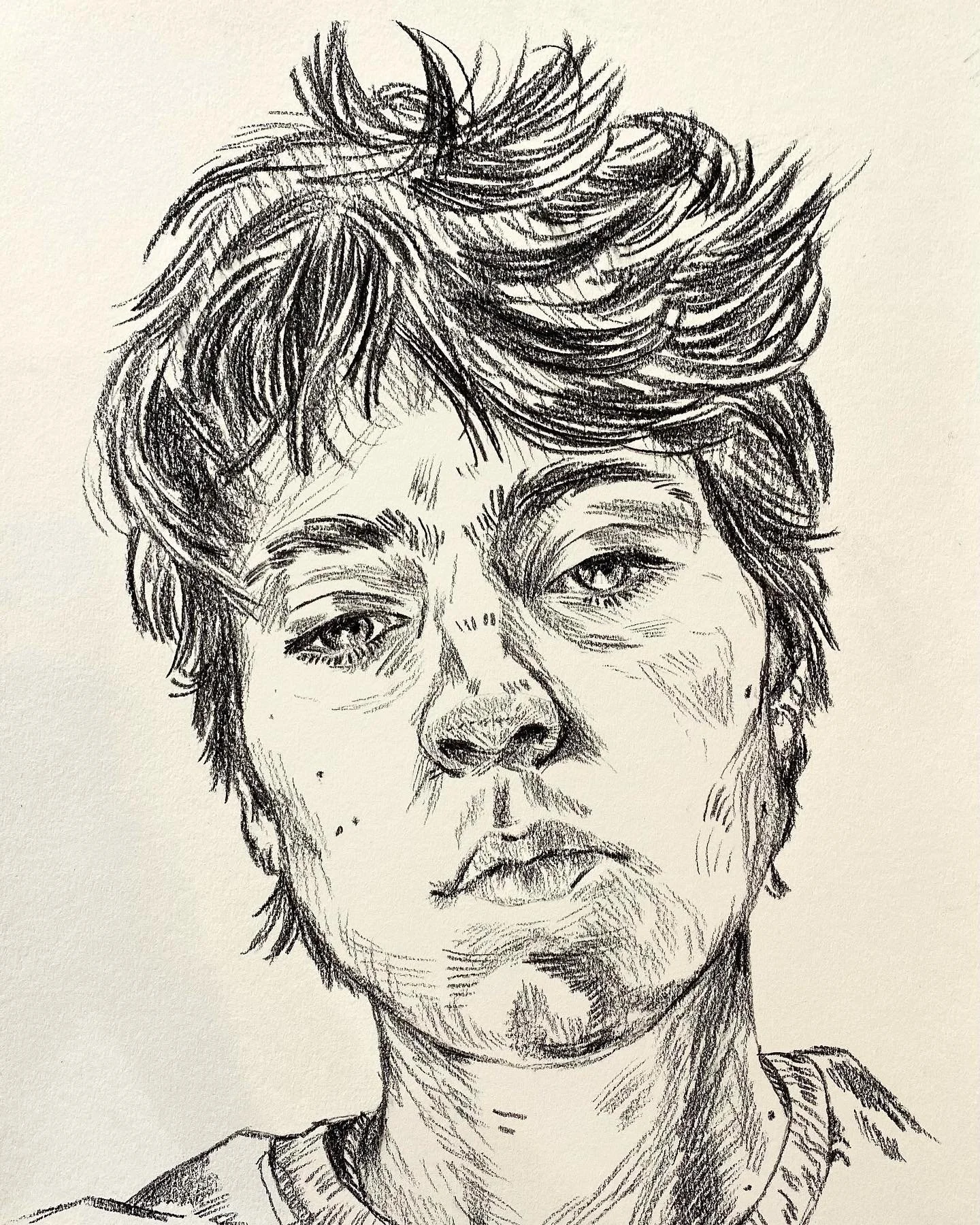 For the above view, I used a diluted blue ink spray to build up the background texture before using a hatching technique with pen to construct the portrait itself.